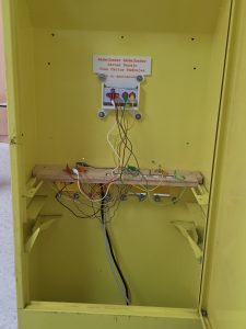 En la imagen apreciamos el panel de conexiones que estará en el interior del artefacto, compuesto por una tabla de madera y algunos tornillos sobre ella en la que los alumnos realizarán el cableado oportuno para que los pulsadores y el joystick se enlacen a la «Makey Makey».