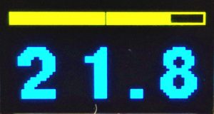 En la siguiente imagen vemos cómo se mostrará en pantalla los datos, siendo la barra amarilla superior la representación de la humedad en % y los números azules la temperatura ambiental expresada con un solo decimal.