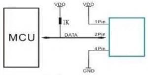 En cuanto al hardware, solo es necesario conectar el pin VCC de alimentación a 3-5.5V, el pin GND a Tierra (0V) y el pin de datos a un pin digital (D2) en nuestro Arduino. El fabricante recomienda conectar una resistencia de 1k-10k en pull-up como se muestra en la imagen.